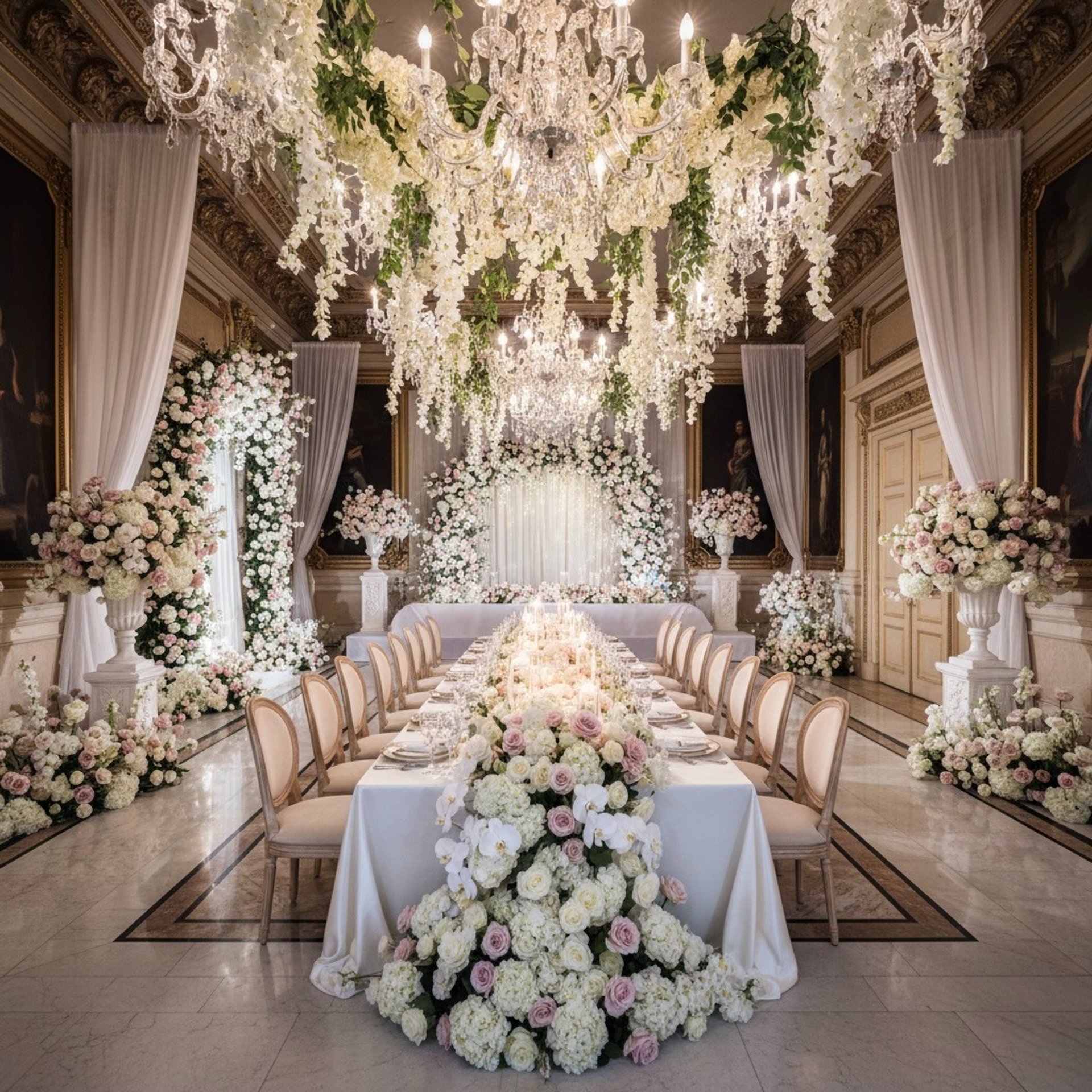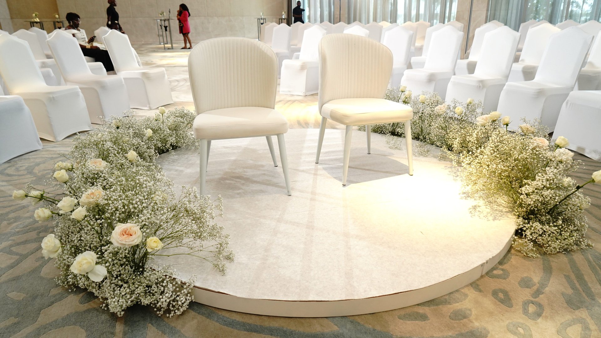 Ambiance lumineuse, florale et décorative inspirée de l’univers du couple.